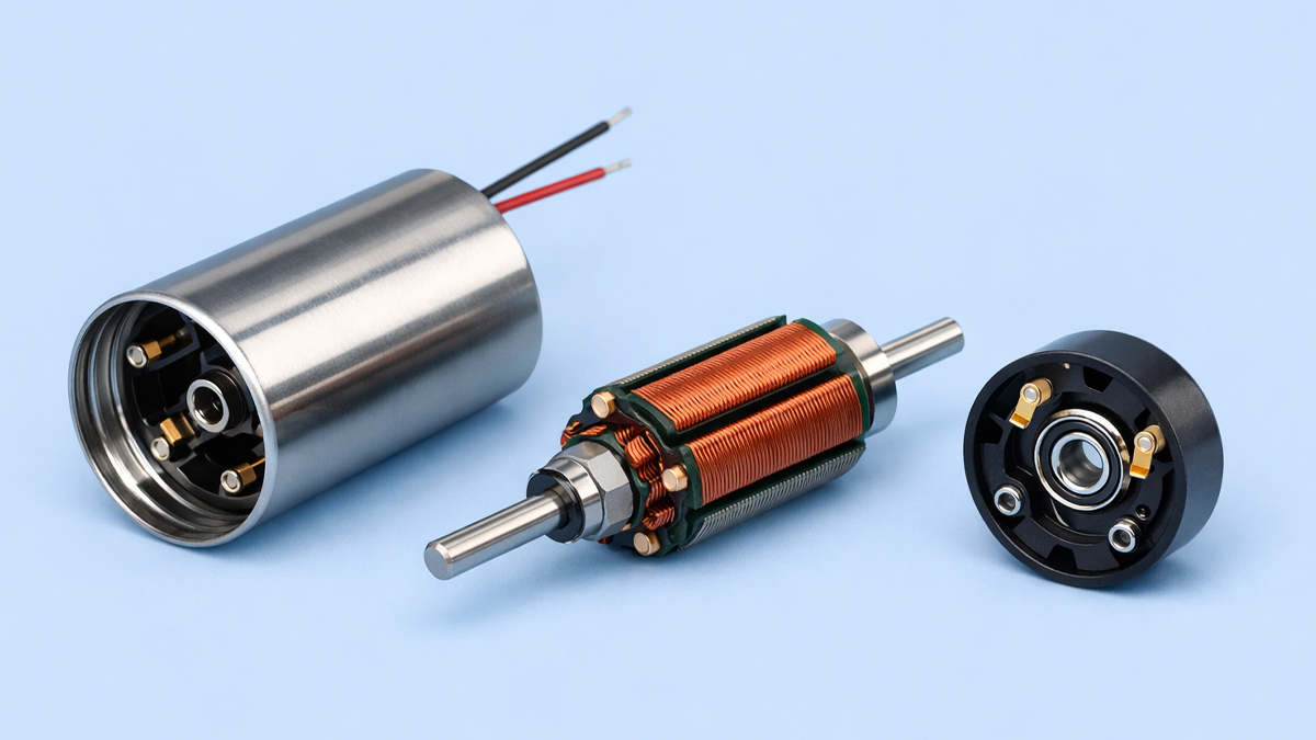 Brushed coreless DC motor: Uses brushes and a commutator to switch current in the rotor. It is simple to drive and responds quickly. Brush wear and electrical noise are tradeoffs.