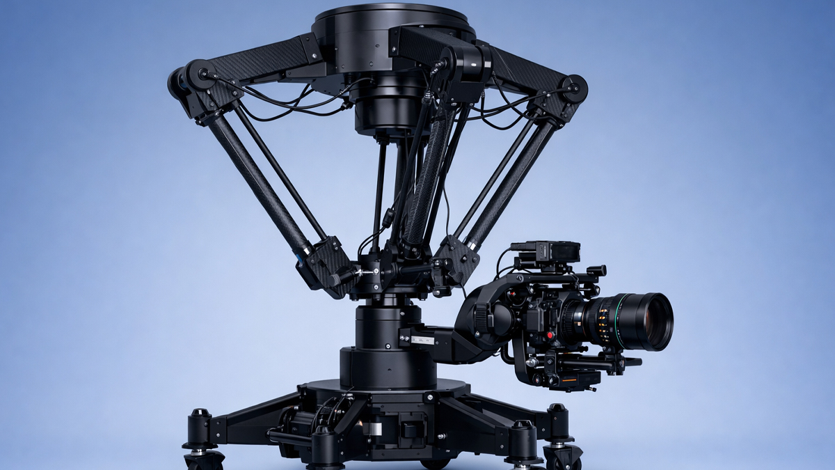 A Delta Arm Rig is a robotic camera arm system that uses three or more linked arms arranged in a triangular formation to control a camera with high speed and accuracy. It is one of the most dynamic tools in the field of robotic camera rigs within the cinema industry.