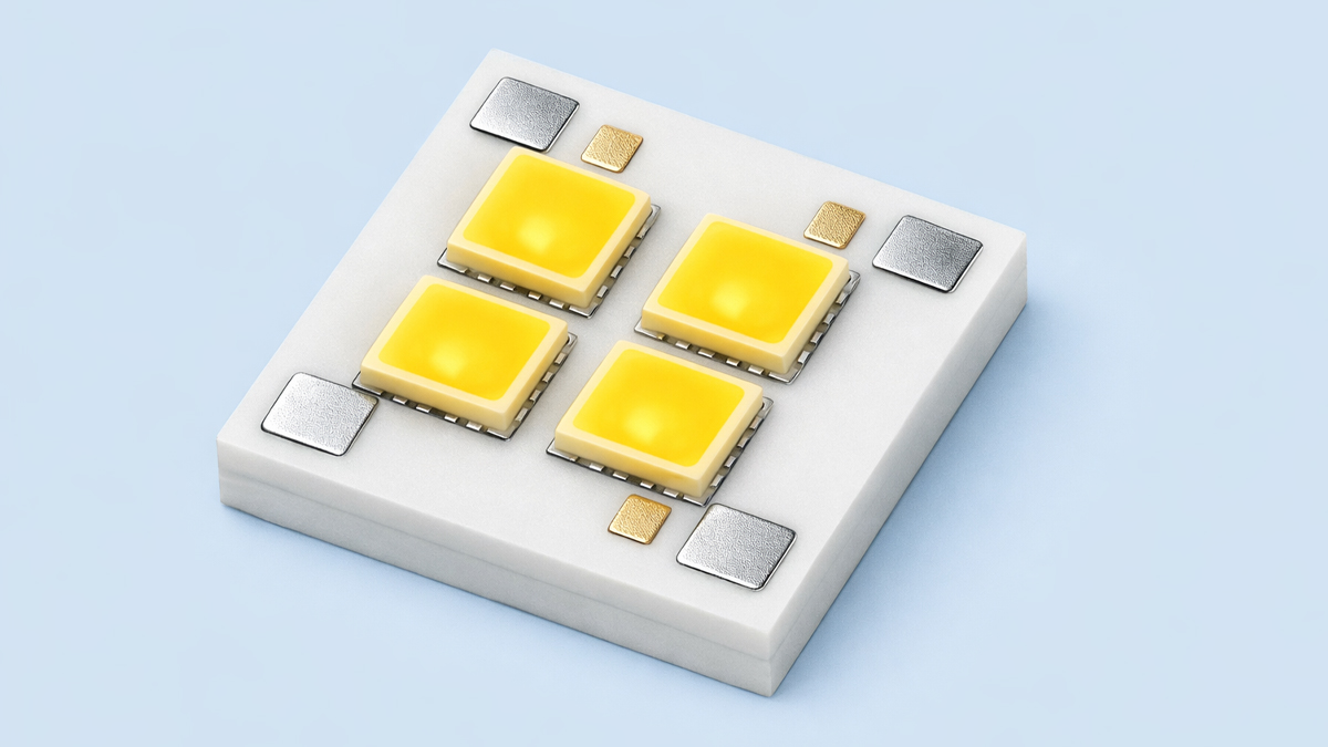 COB Flip Chip LED: Chip on board configuration using Flip Chip technology allows multiple chips to be mounted directly on a single substrate. This design is common in high brightness studio lighting panels and cinema flood lights.